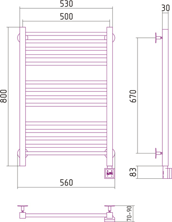 Отличный внешний вид конструкции, электрического полотенцесушителя Сунержа, модели Модус, с внешними габаритами – 800 мм в высоту, и 500 мм в ширину, делают его способным не только в максимально короткие сроки просушивать вещи, но так же, и прогревать помещение, в котором вы его установите.