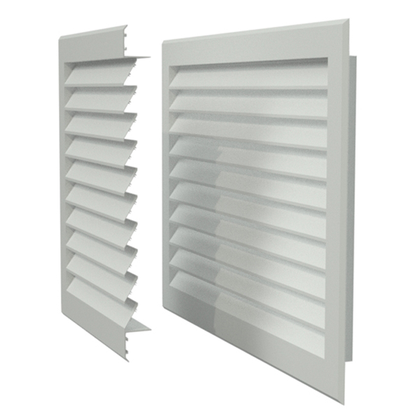 Решетки EAL - алюминиевые решетки для наружной установки, покрашены методом порошкового напыления в белый цвет (RAL 9016). Живое сечение составляет 41% от площади решетки. Жалюзи расположены под углом 45 градусов, что исключает попадание воды или снега через решетку.